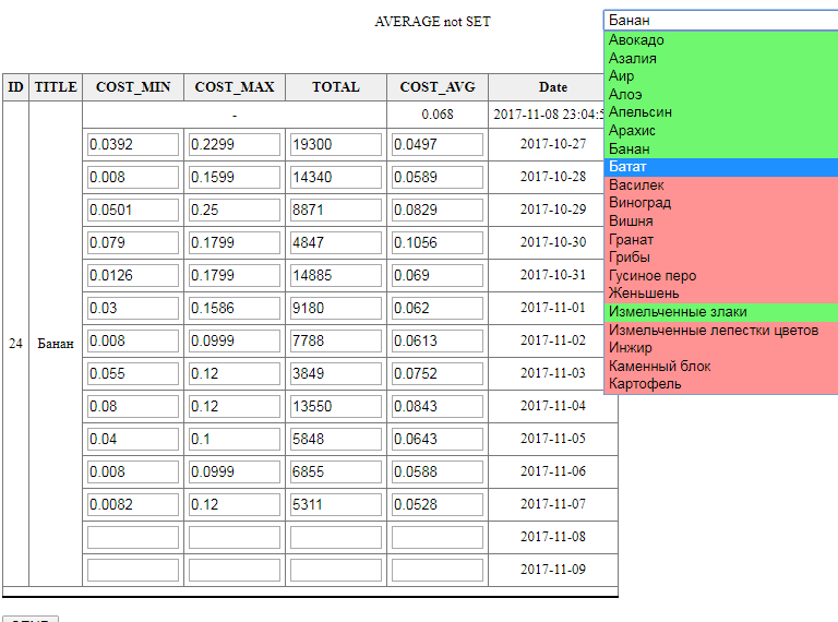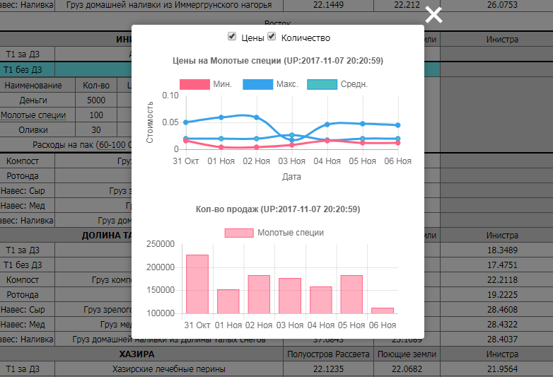 08.11.17: Паки - графики Слепил возможность просматривать цены ингредиентов в виде графика. Если сильно заморочиться, то можно будет раз в недельку их обновлять для более точного среднего значения + в дальнейшем, когда данных соберется хорошее кол-во, можно будет сделать график на более долгие промежутки, типа от последней недели до последнего года.